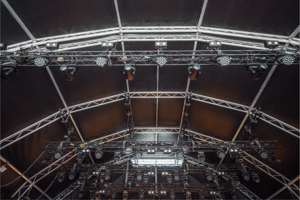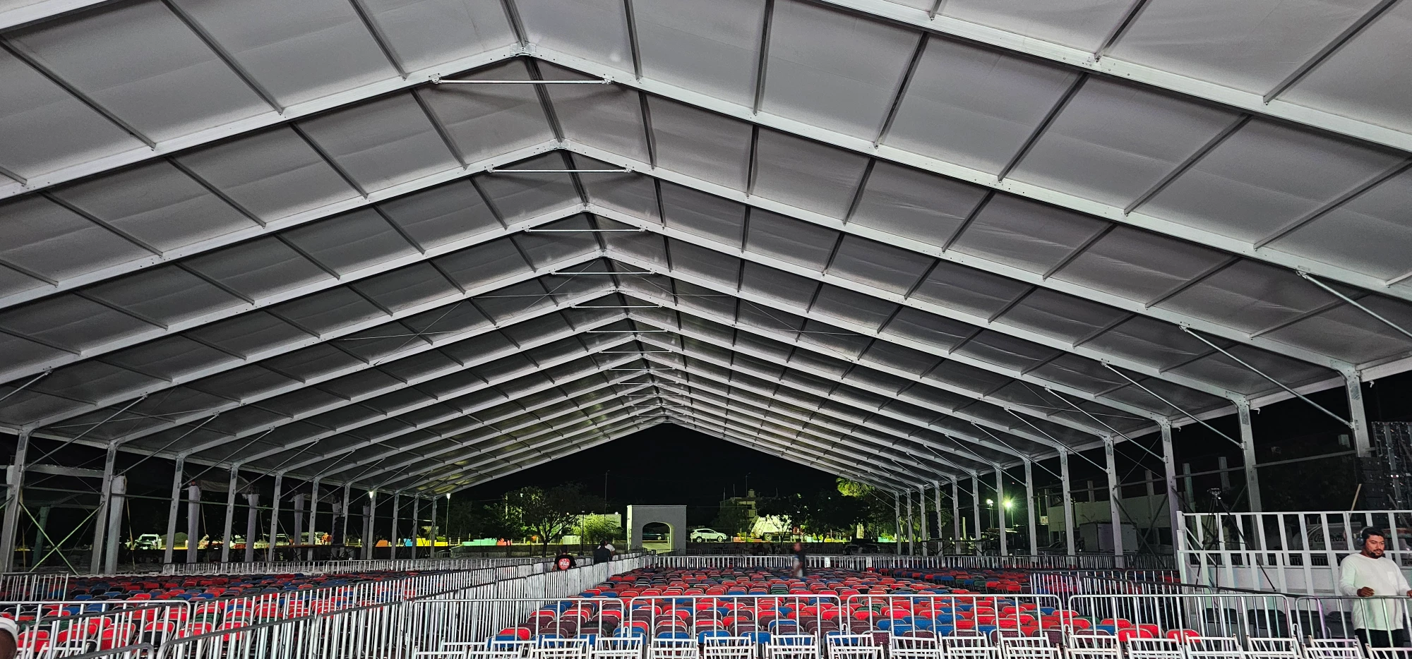 Ofrecemos carpas multiusos en modelos como 2 aguas, arcum, poligonales y festival, con anchos de 5m hasta 50m sin postes intermedios y alturas de 4m a 6m.